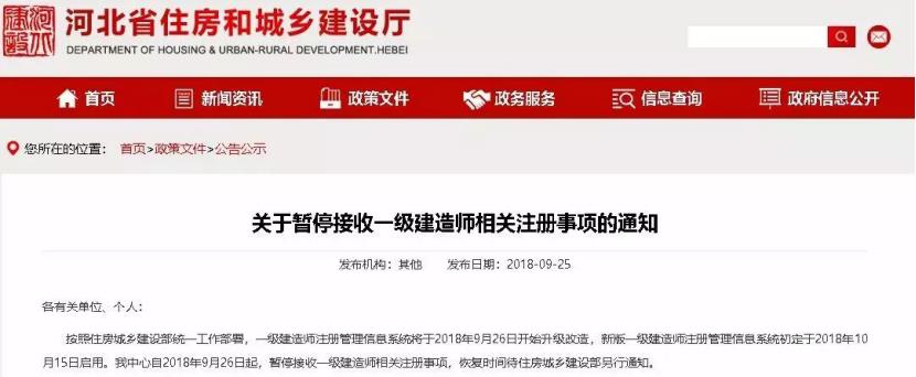 2、9月26日起,暫停接收一級建造師相關(guān)注冊事項(xiàng),恢復(fù)時(shí)間待住房城鄉(xiāng)建設(shè)部另行通知。